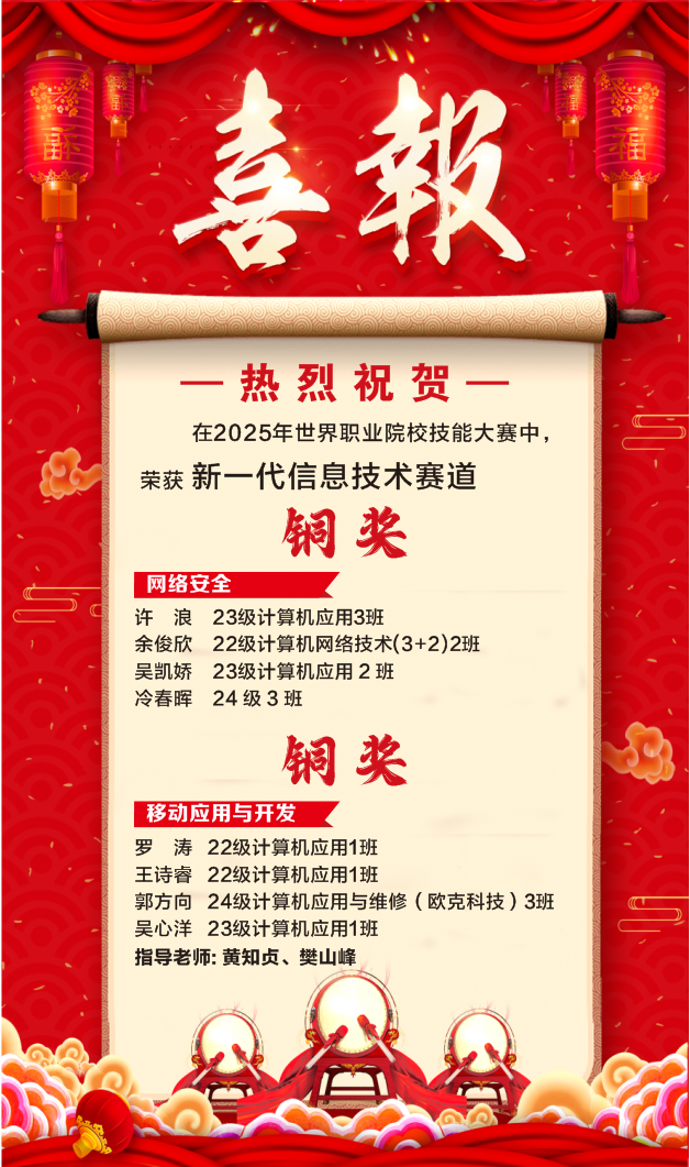 近日,2025年世界職業(yè)院校技能大賽總決賽新一代信息技術(shù)賽道(中職組)在江蘇南京隆重舉行。在這場(chǎng)由教育部、國(guó)家發(fā)展與改革委員會(huì)、工業(yè)和信息化部等多部委聯(lián)合主辦的國(guó)家級(jí)A類賽事中,共有來自全國(guó)各省、市及建設(shè)兵團(tuán)的152支精英代表隊(duì)參賽,競(jìng)爭(zhēng)激烈,江西省有4支隊(duì)伍獲獎(jiǎng),其中我校兩支參賽團(tuán)隊(duì),雙雙榮獲全國(guó)銅獎(jiǎng)!