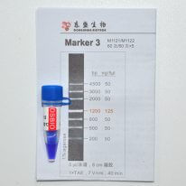 Marker 3是由7條雙鏈線狀DNA片段混合而成的DNA分子量標準(DNA Marker/ DNA Ladder),適用于確定200?bp至4.5?kb的線性雙鏈DNA片段大小,指示帶為1200 bp,便于電泳后觀察。每條帶都通過嚴格的物理定量,可用于測定目的片段的大小和含量。