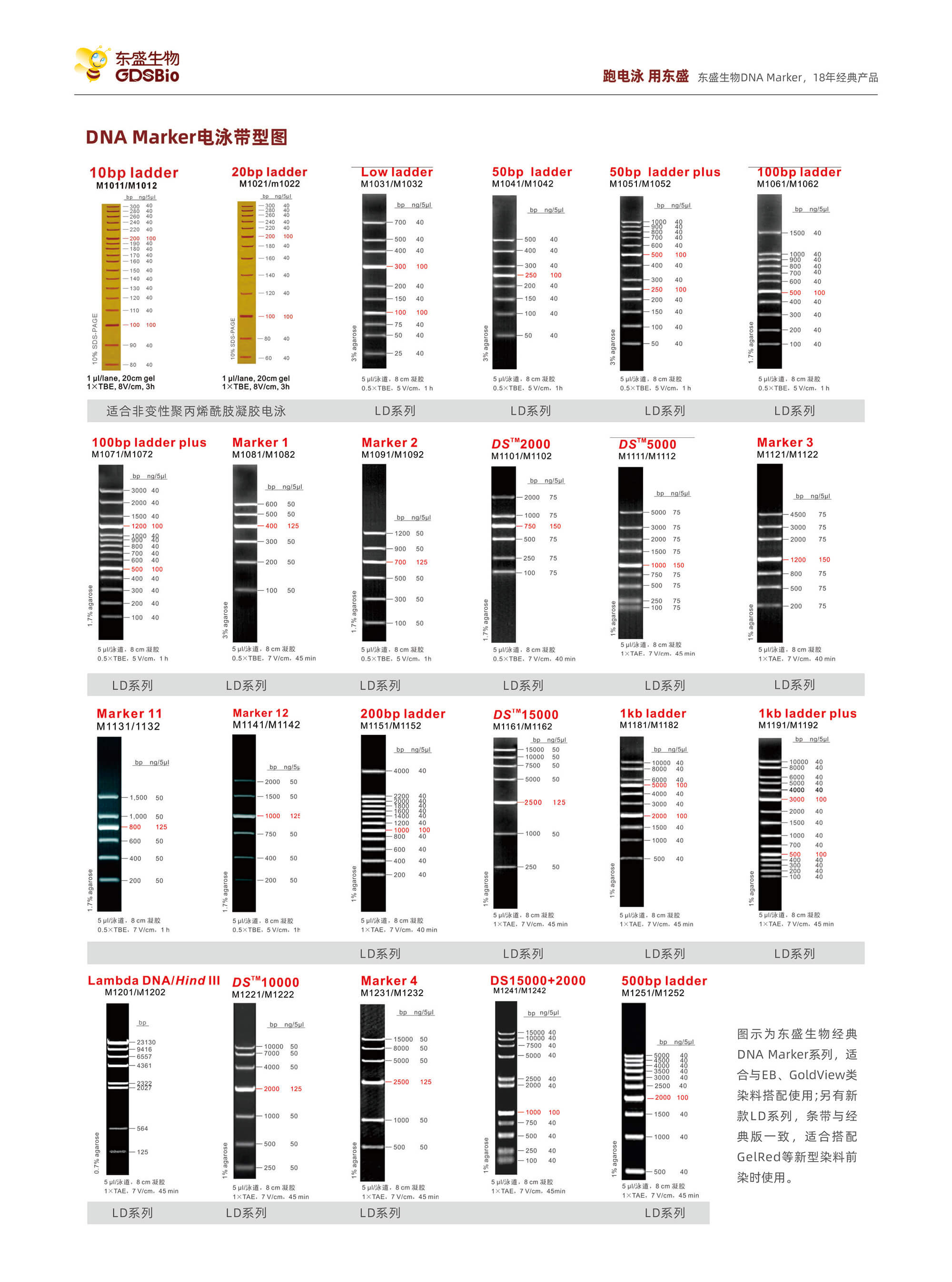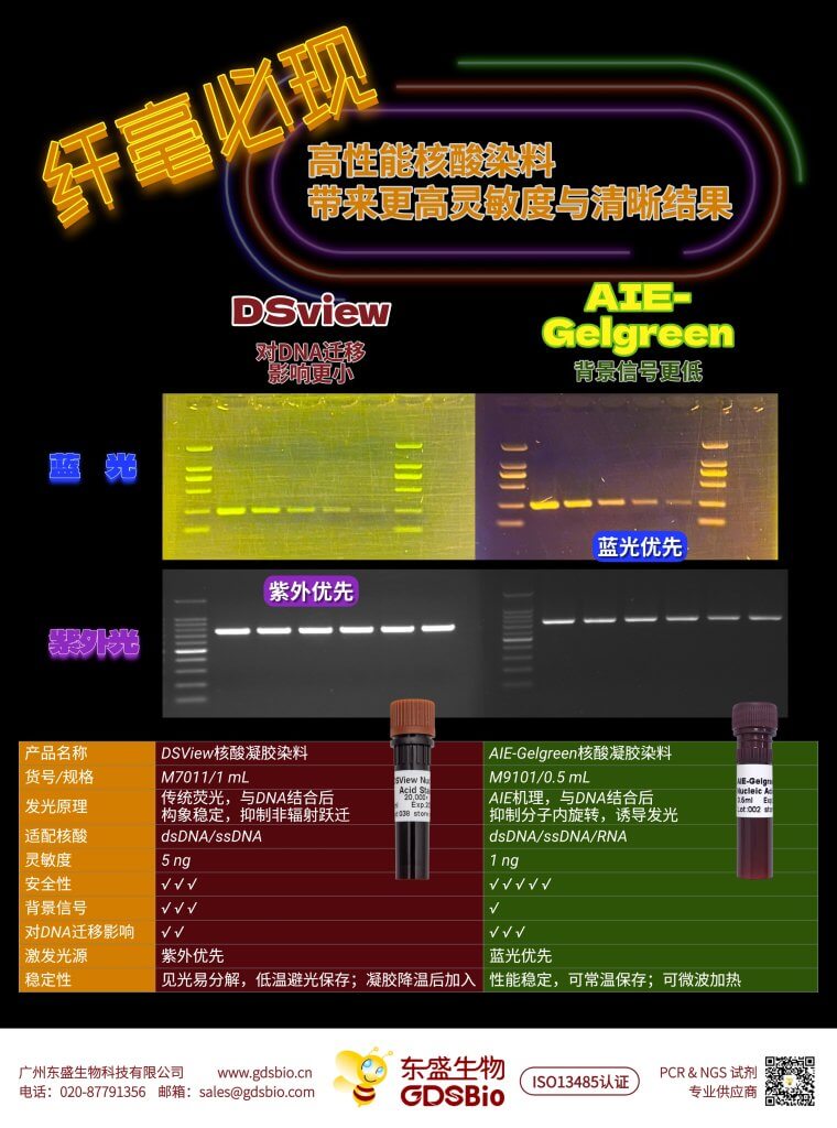 ?? 東盛生物提供?高質量 DNA Marker、核酸染料、電泳緩沖液、上樣緩沖液、瓊脂糖等試劑,助力科研人員(yuan)高效、穩定(ding)地完(wan)成核酸電(dian)泳工作。