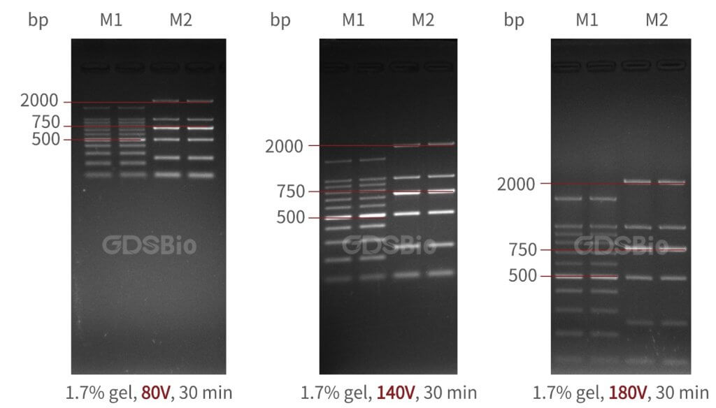 小片段 DNA 分離(幾十到幾百 bp):可稍(shao)高電(dian)壓(8–10 V/cm)。